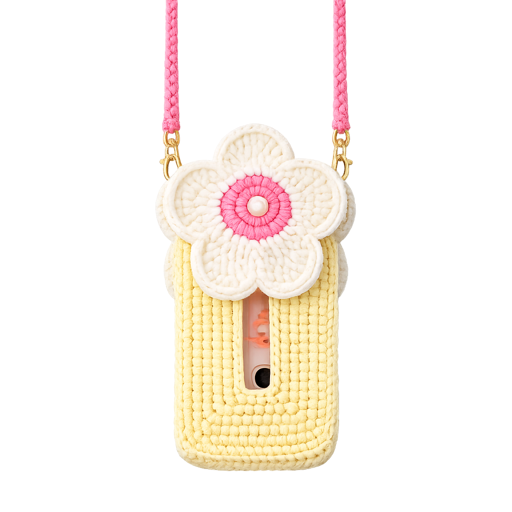 Bring a touch of sunshine to your everyday look with this charming handmade daisy phone bag from Knit & Bloom. Crafted with soft, premium yarn, this cheerful crossbody features a delicate floral flap design in cream and blush tones, set against a warm yellow body for a fresh, playful aesthetic.