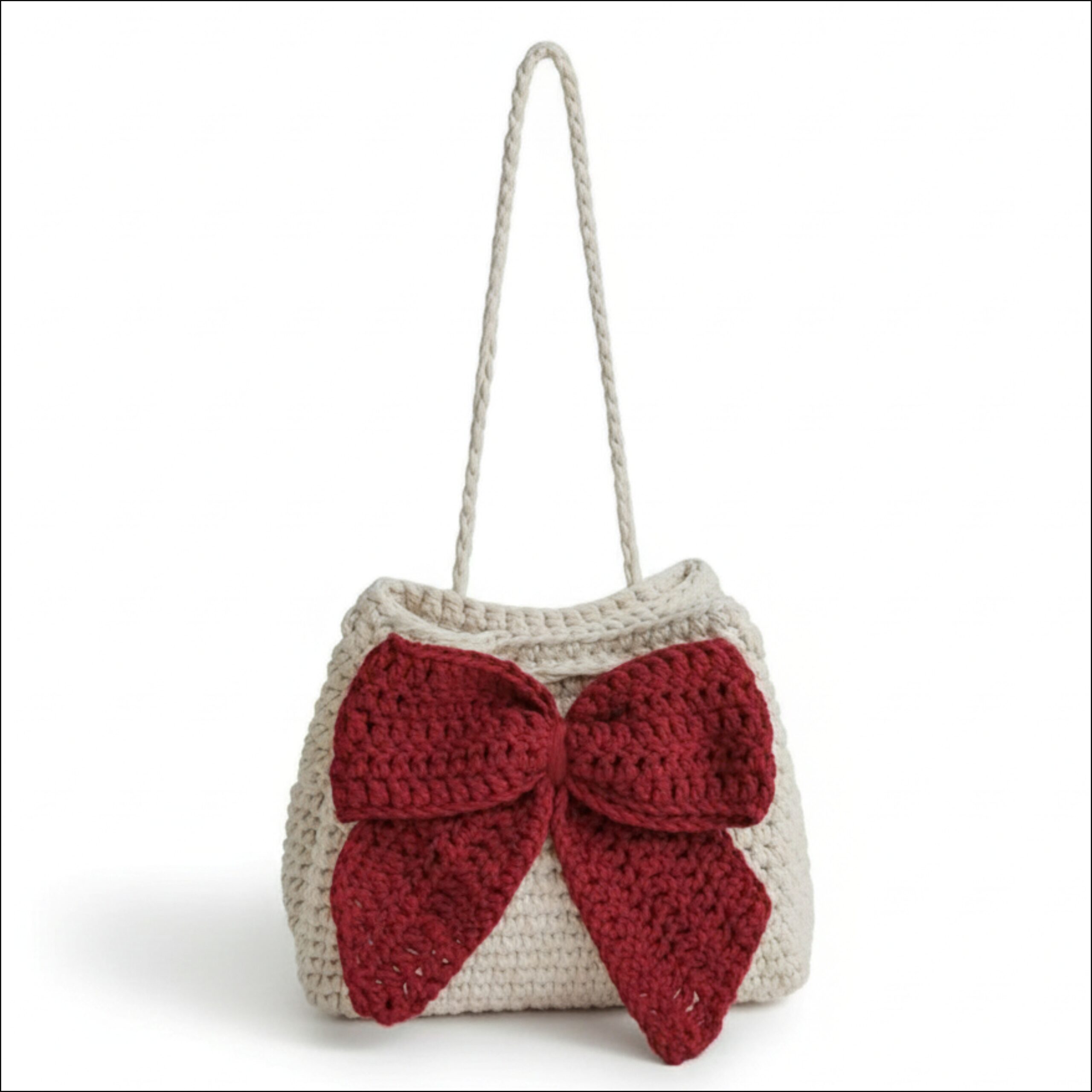 Make a charming style statement with this Handmade Crochet Bow Sling Bag from Knit & Bloom. Crafted with premium crochet yarn, this bag features a soft cream base beautifully accented with a bold maroon crochet bow, adding a cute yet elegant touch. Perfect for casual outings, brunch dates, and gifting.