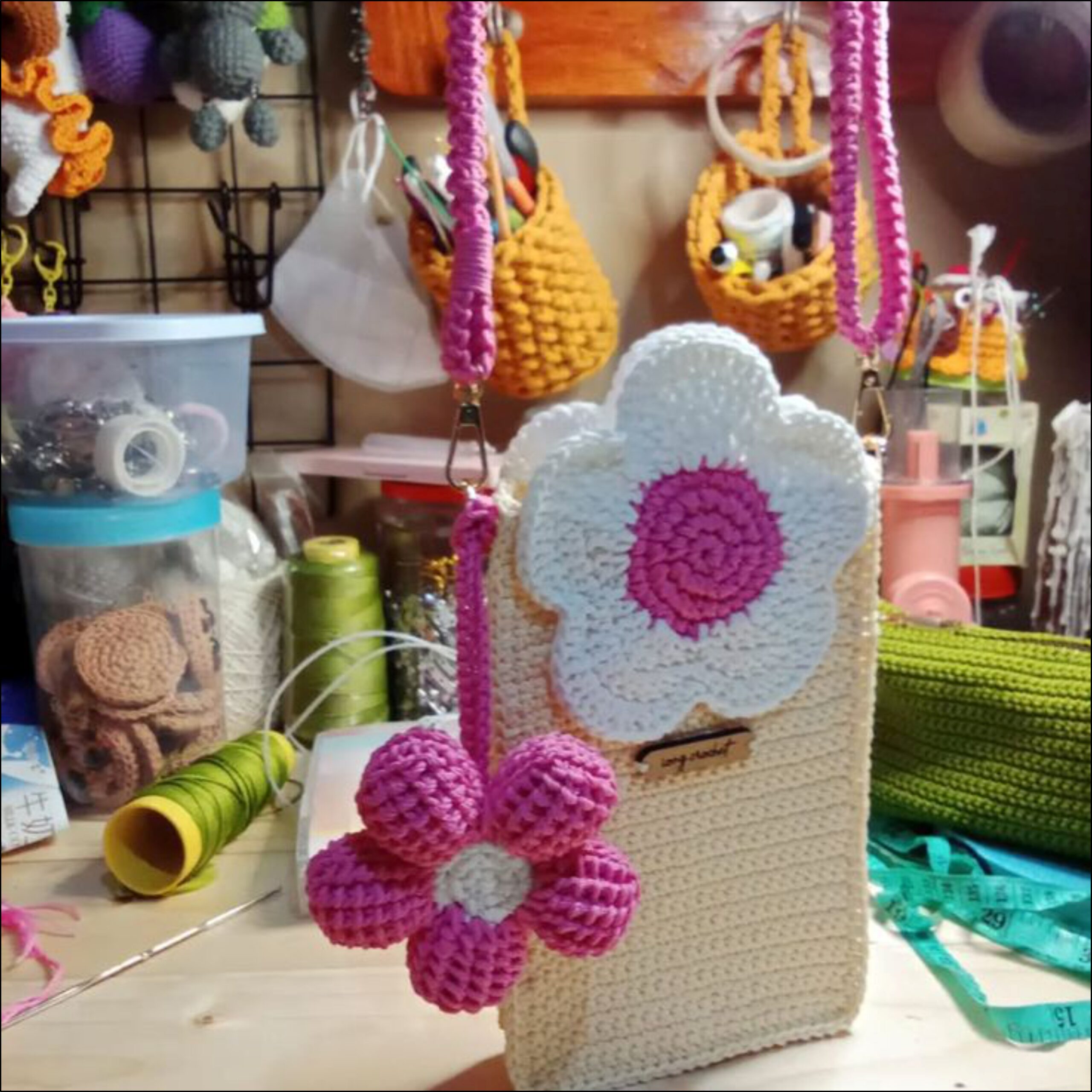 handmade crochet sling pouch, crochet flower bag, crochet mobile pouch, floral crochet sling bag, handmade crochet pouch India, knit and bloom crochet